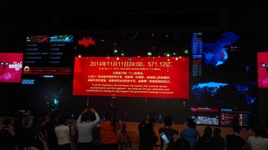 12点零时之后,阿里巴巴天猫“双11”战绩公布,11月11日当天,天猫平台实现交易总额达到了571.12亿元人民币,约93.39亿美元,来自无线端的交易额也占到了42.6%。阿里巴巴再次刷新了全球最大购物日的平台交易记录,且产生了2.78亿个物流因此平台产生。去年,天猫双11的成交额为362亿元美元。广东、浙江、江苏成为分列国内交易量前三省。