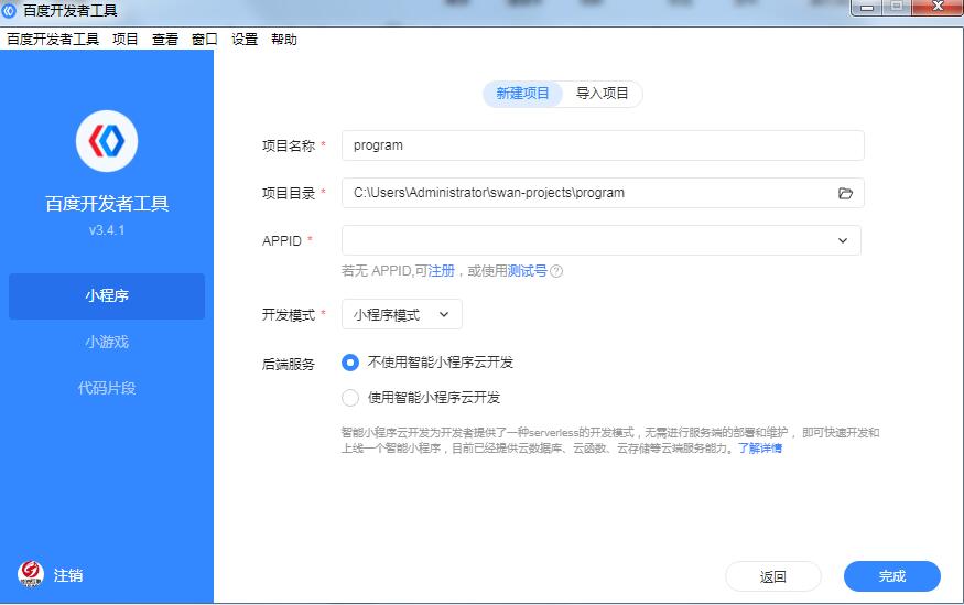2、打开开发者工具,填写名称,路径选择你刚才新建的空文件夹(百度智能小程序会自动生成文件)。