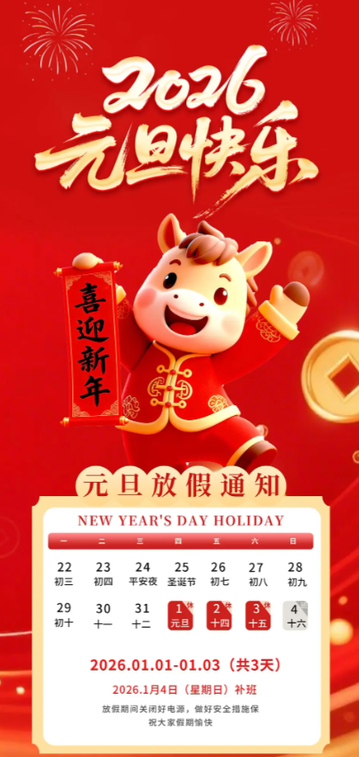 尊敬的各位客户朋友和同事: 根据国务院假期安排,我司元旦放假时间为: 1月1日(周四)至1月3日(周六),共3天。 1月4日(周日)正常上班。